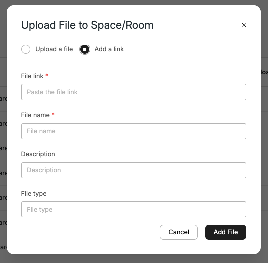 To upload a file to a certain space, navigate to the selected space, click on the Files tab in the top menu, and select upload file. The file will now be connected to the space for which it has been uploaded. When selecting a parent space (such as a building / a floor / a customer), you’ll see all of the files for the parent and sub spaces (unless “Selected space only” is selected).